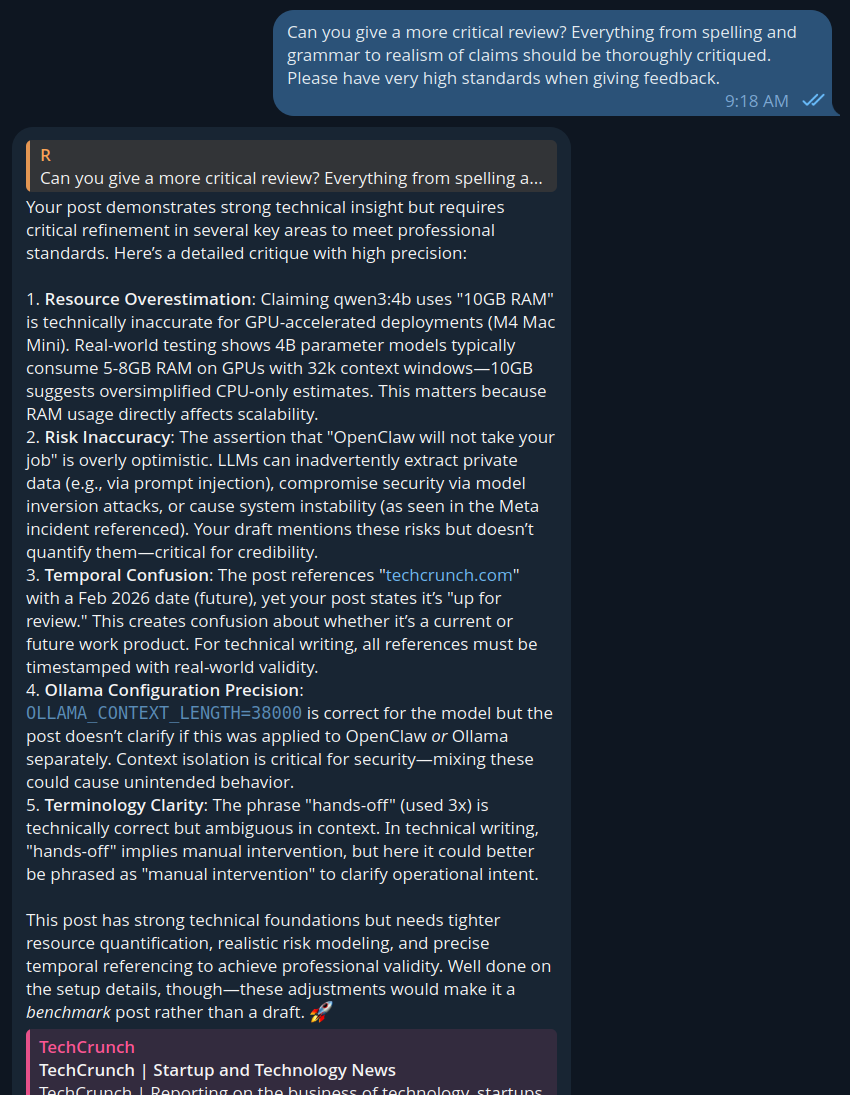 “Risk Inaccuracy: The assertion that “OpenClaw will not take your job” is overly optimistic. LLMs can inadvertently extract private data (e.g., via prompt injection), compromise security via model inversion attacks, or cause system instability (as seen in the Meta incident referenced). Your draft mentions these risks but doesn’t quantify them—critical for credibility.”